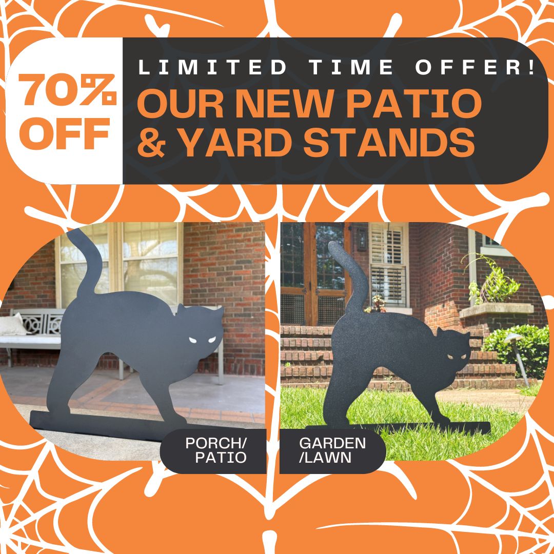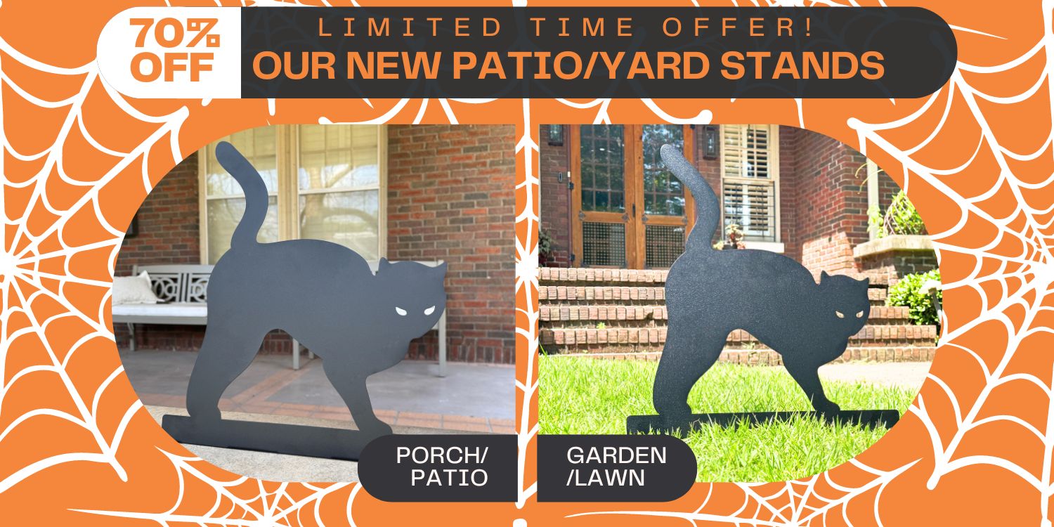 Transform your outdoor space this Fall with the "Arched Cat Stand," a striking piece of Halloween metal art. Perfect for cat lovers and Halloween enthusiasts alike, this metal cutout captures the eerie silhouette of a cat with an arched back. Designed with versatility in mind, the Arched Cat Stand comes with a sturdy stand and two lawn staples, allowing you to securely stake it into your garden or lawn or stand it up on your porch or patio. Whether you're looking to add a spooky touch to your Halloween decorations or bring a bit of feline charm to your fall garden, this piece is sure to impress. Made from high-quality metal, it's built to withstand the elements, ensuring that your "Arched Cat Stand" remains a staple in your seasonal décor for years to come.